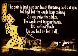 The Poker Dealer The pain is just a poker dealer throwing cards at you, You fold but the cards keep coming, So you raise the stakes, The cards rest in your hands, Its the final flush, Do you fold or bet it all… by ~ jbritt No claim to photo Share this: Click to share on X (Opens in new window) X Click to share on Facebook (Opens in new window) Facebook Like Loading...