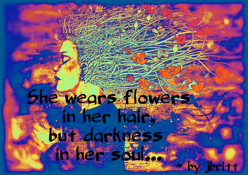 Flowers – Quote She wears flowers in hair But darkness in her soul… ~ by jbritt Share this: Click to share on X (Opens in new window) X Click to share on Facebook (Opens in new window) Facebook Like Loading...