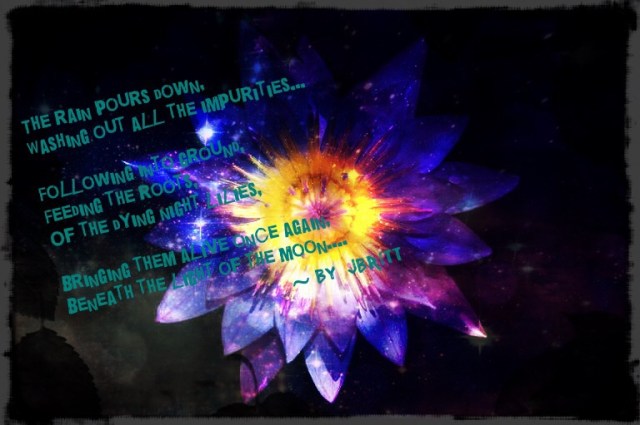 Night Lilies… The rain pours down, Washing out all the impurities… Following into the ground, Feeding the roots, Of the dying night lilies, Bringing them alive once again, Beneath the light of the moon…. ~ by jbritt Share this: Click to share on X (Opens in new window) X Click to share on Facebook (Opens in new window) Facebook Like Loading...
