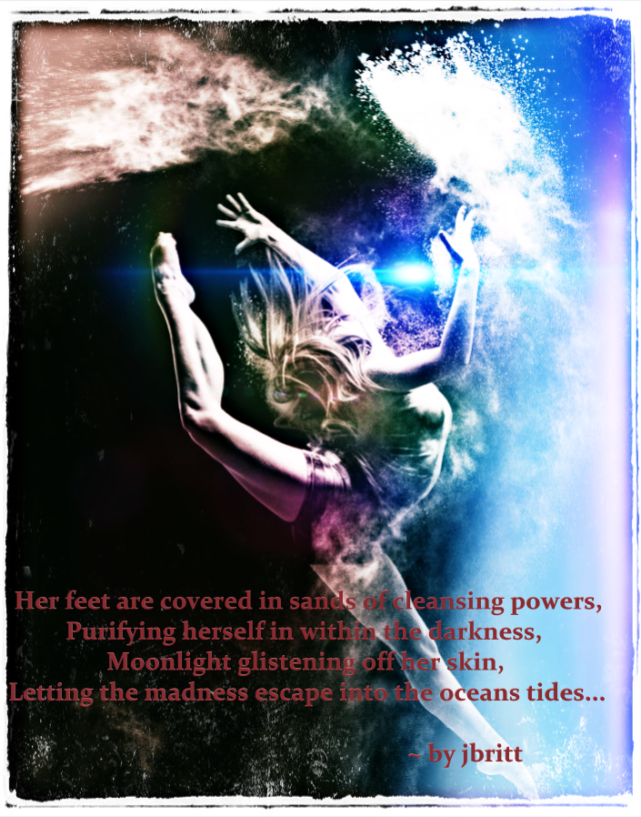 But she keeps dancing, Her feet are covered in sands of cleansing powers, Purifying herself in within the darkness, Moonlight glistening off her skin, Letting the madness escape into the oceans tides…